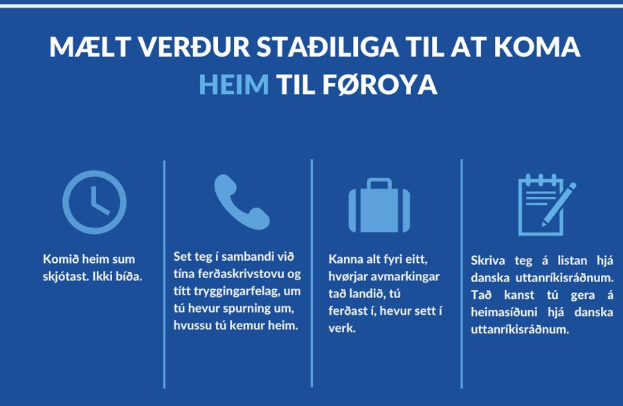 Tey, sum hava spurningar viðvíkjandi heimferð til Føroya við Atlantic Airways, eiga at venda sær beinleiðis til flogfelagið á +298 34 10 00 og, tey við SAS beinleiðis til flogfelagið á +45 70 102 000. Tað kann eisini vera hent hjá fólki, ið skulu ferðast til Føroya næstu dagarnar, at venda sær til sítt tryggingarfelag. Tey, sum er stødd uttanfyri Danmark, eiga fyrst at seta seg í samband við flogfelagið ella ferðaskrivstovuna, tey hava nýtt.